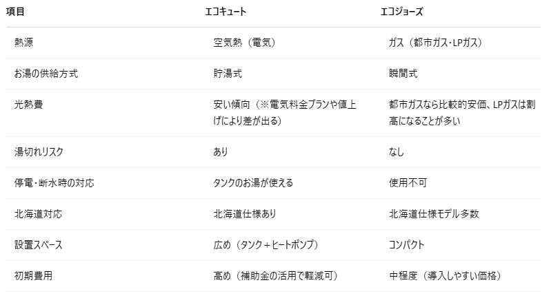 ここではエコジョーズとエコキュートの違いを一目で比較できる表を用意しました。