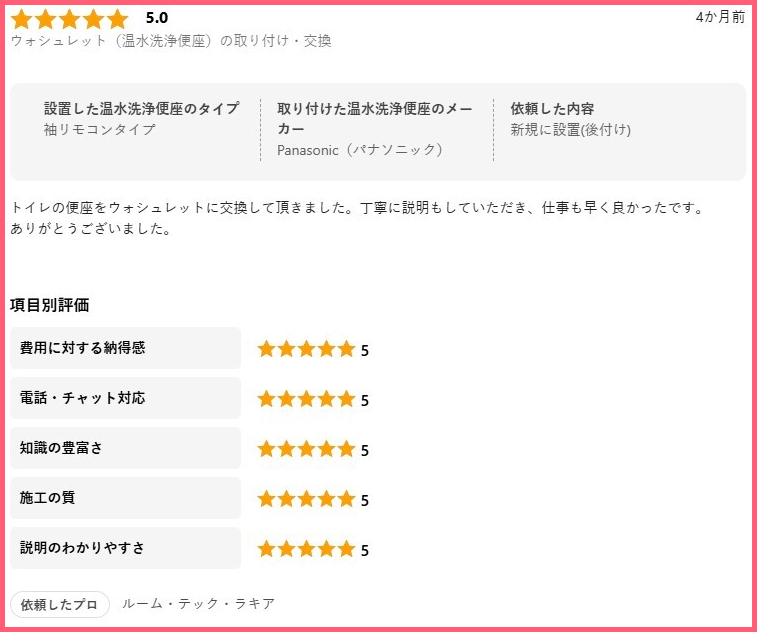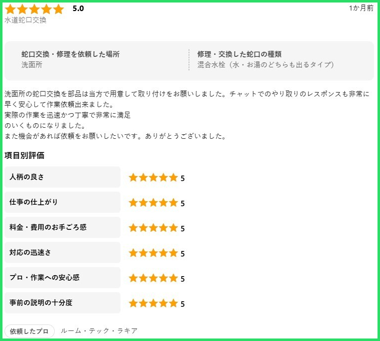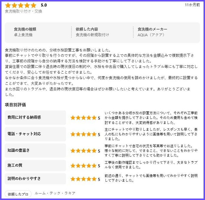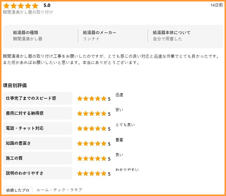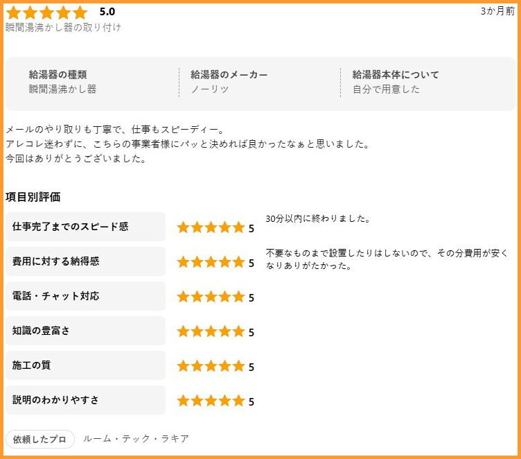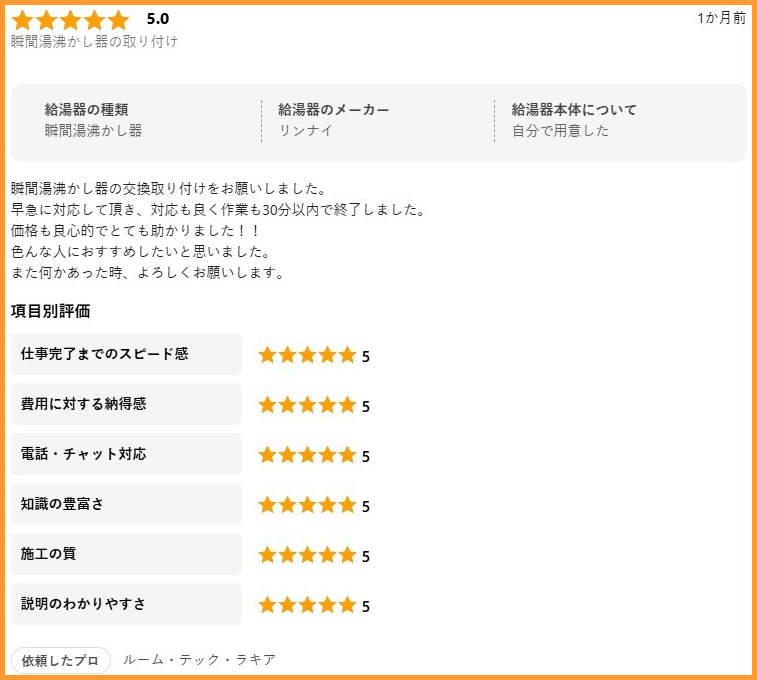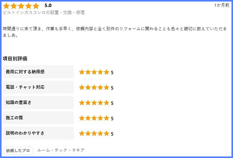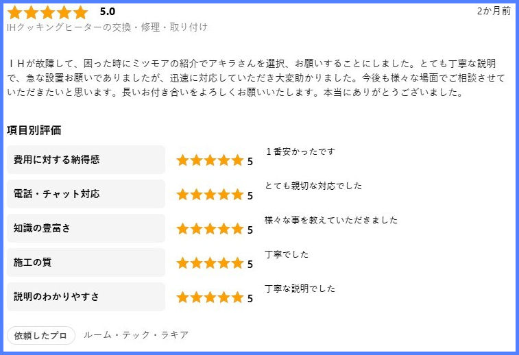 ルーム・テック・ラキアは家のお困りごとを解決するマッチングサービスのミツモア様(※1)、ツクリンク様にて数々の高評価をいただいております。