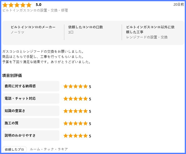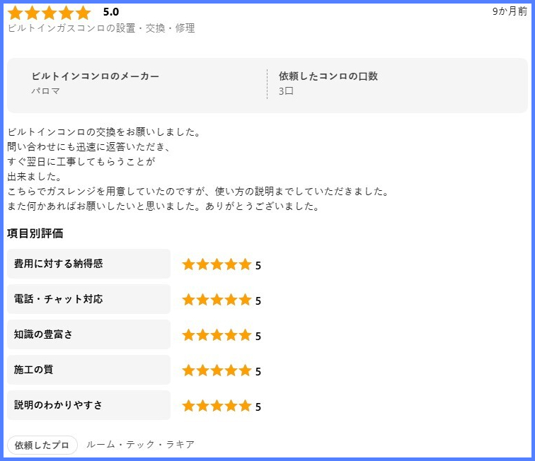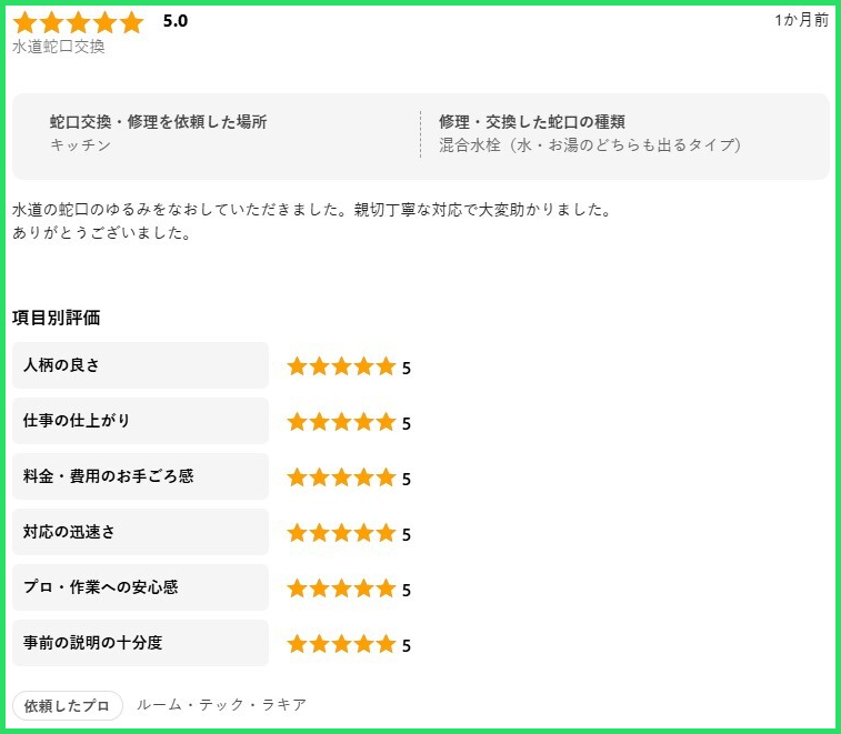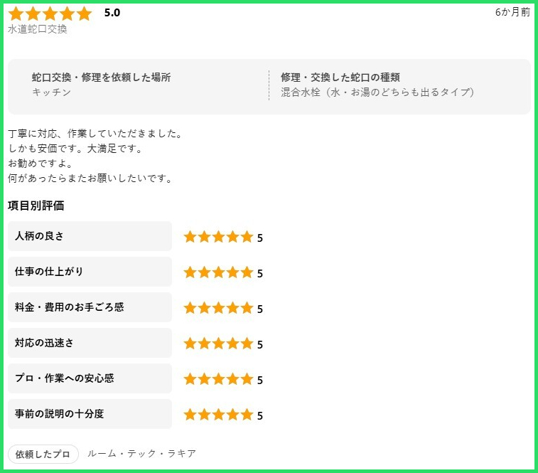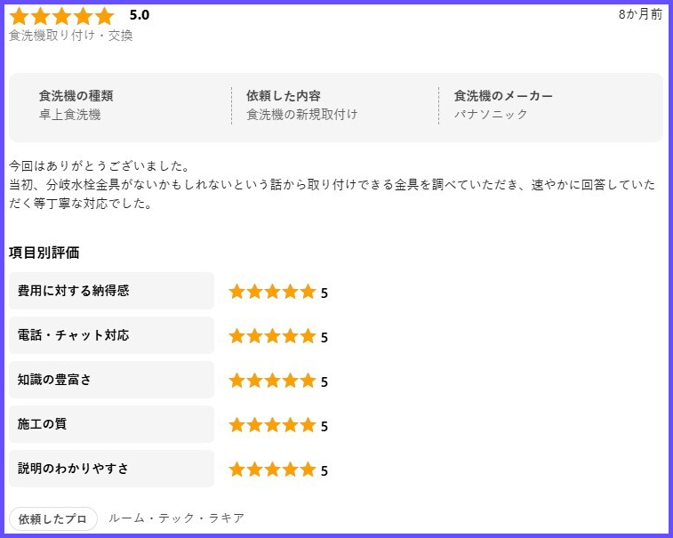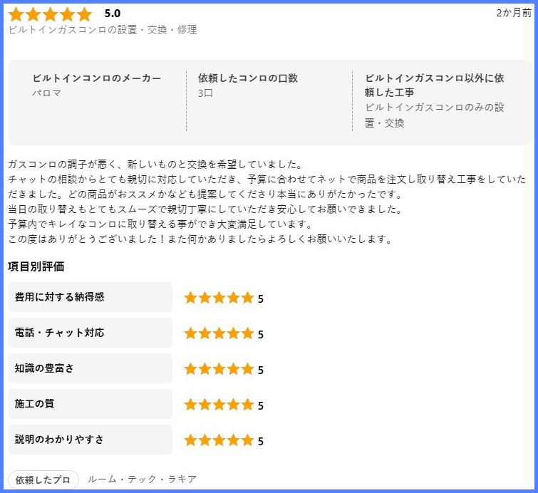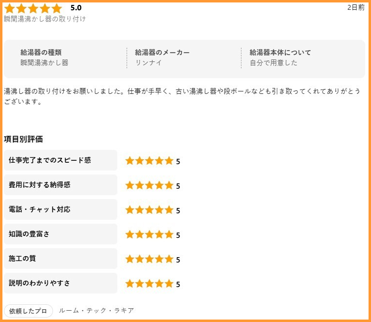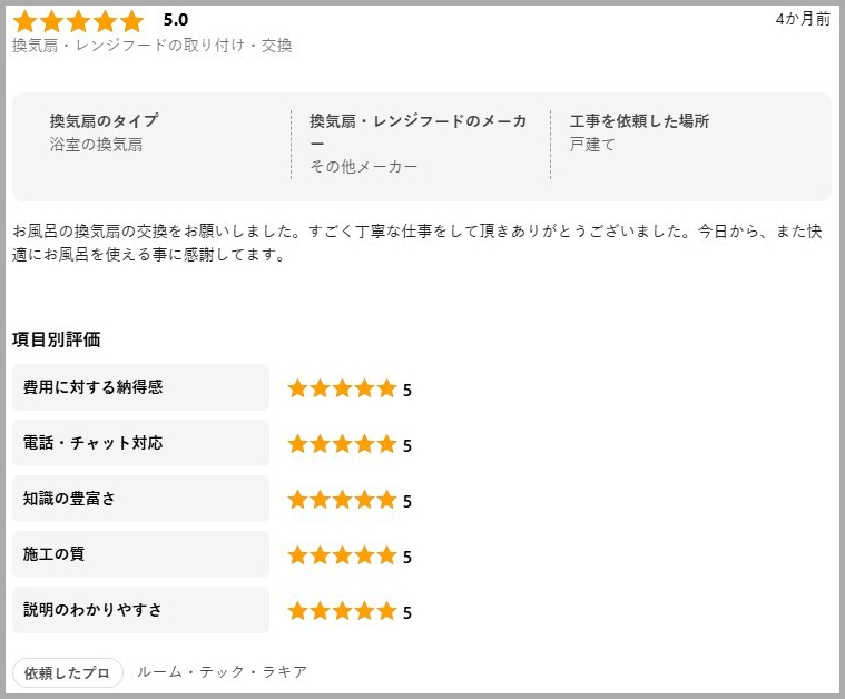 ルーム・テック・ラキアは家のお困りごとを解決するマッチングサービスのミツモア様(※1)、ツクリンク様にて数々の高評価をいただいております。